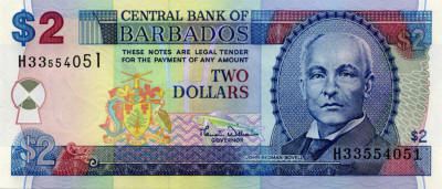 P.29a - 1 Dollar - ND (1973). Portrait S.J. Prescod at right , arm at left center. Signature: C. Blackman. Watermark:Map of Barbados. Printer:TDLR.