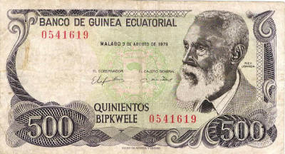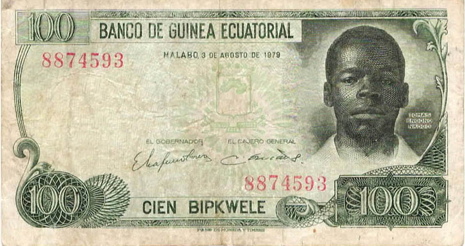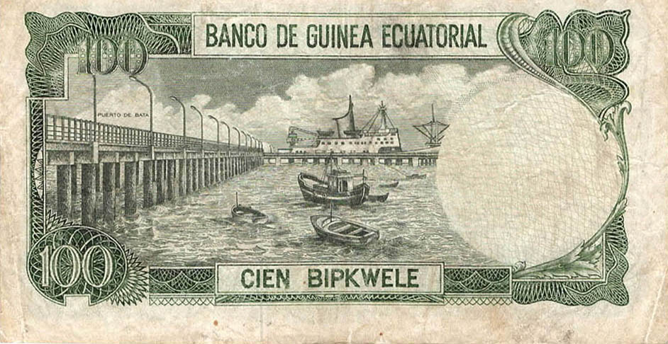 P.11 - 100 Ekuele - 7.7.1975. President M.N.Biyogo at right. Watermark: M.N.Biyogo. Printer: TDLR.