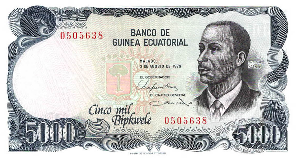 P.13 - 1000 Ekuele - 7.7.1975. President M.N.Biyogo at right. Watermark: M.N.Biyogo. Printer: TDLR.