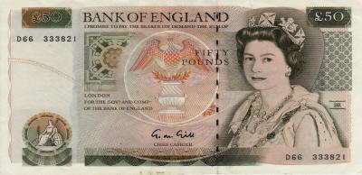P.393b - 50 Pounds (2011). Queen Elizabeth II at right. Signature V. Cleland.