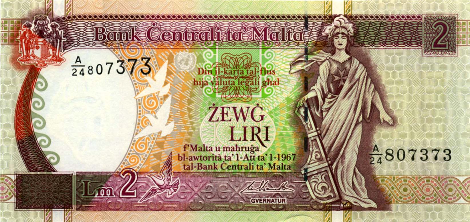 P.45d - 2 Liri - L.1967 (1989). Doves at left , Malta standing with rudder at center. Watermark: Turreted Head of Malta. Signature P.Bonello.