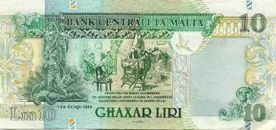 P.36a - 10 Lira - L.1967 (1979). Statue of "Justice" at center. Watermark: Allegorical Head of Malta. Printer: TDLR.