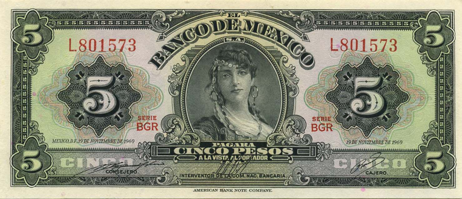 P.62a - 5 Pesos - 3.12.1969. J.Ortiz de Dominguez at right. £ signature varieties. Printer: BdM.