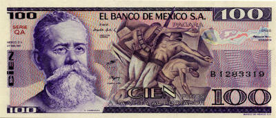 P.68a- 100 Pesos - 5.7.1978. V.Carranza at left , La Trinchera painting at center. 3 signature varieties. Printer: BdM.