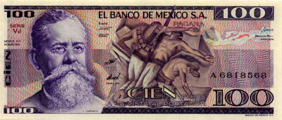 P.74a- 100 Pesos - 27.1.1981. V.Carranza at left , La Trinchera painting at center. 4 signature varieties. Printer: BdM. UV fibers fluorescent.