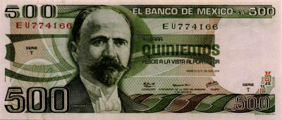 P.69- 500 Pesos - 29.6.1979. F.I.Madero at left. 3 signature varieties. Printer: BdM.