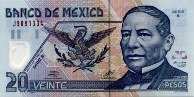 P.116b - 20 Pesos - 17.5.2001. B. Juárez at right. Polymer plastic.