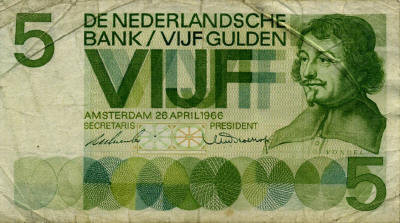 P.90a - 5 Gulden - 26.4.1966. Joost van den Vondel at right.