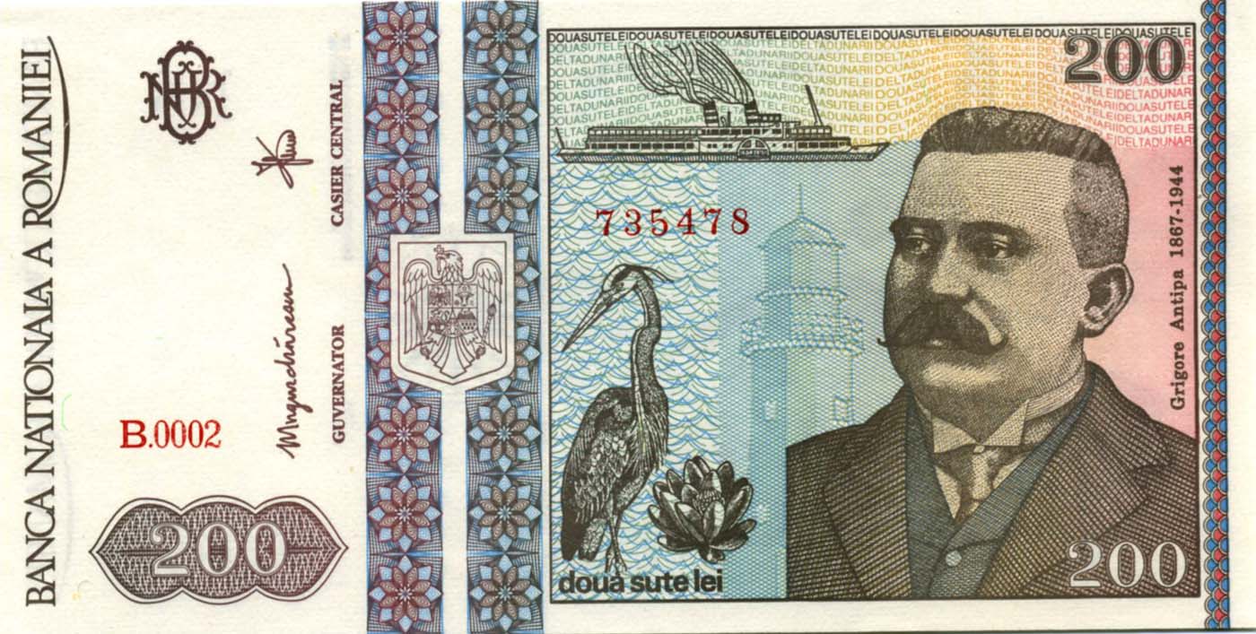 P.100 - 200 Lei - 1992. Steamboat Tudor Vladimirescu above grey heron and Sulina Lighthouse , Grigore Antipa at right.