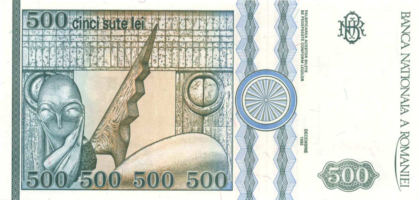 P.101a - 500 Lei - 1992. Constantin Brāncusi at right and his Infinite colum.