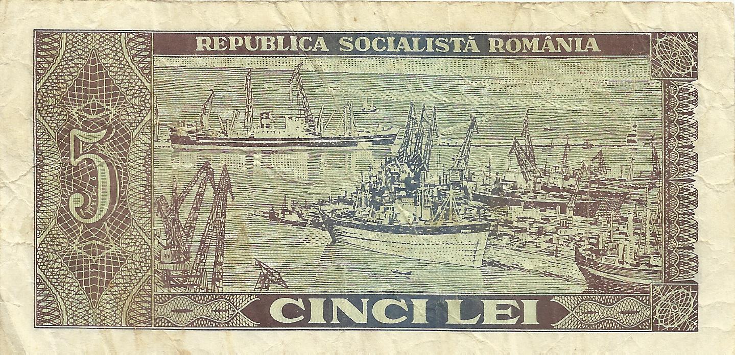 P.93a - 5 Lei - 1966. Cargo ship a dockside.