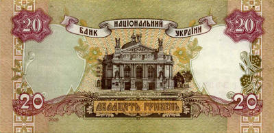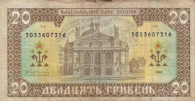 P.107a - 20 Hryven - 1992 (1996). Liviv Hopera House at center. Signature: Getman.