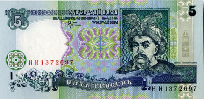 P.105a- 5 Hryven - 1992 (1996). B. Khmelnytsky at center.