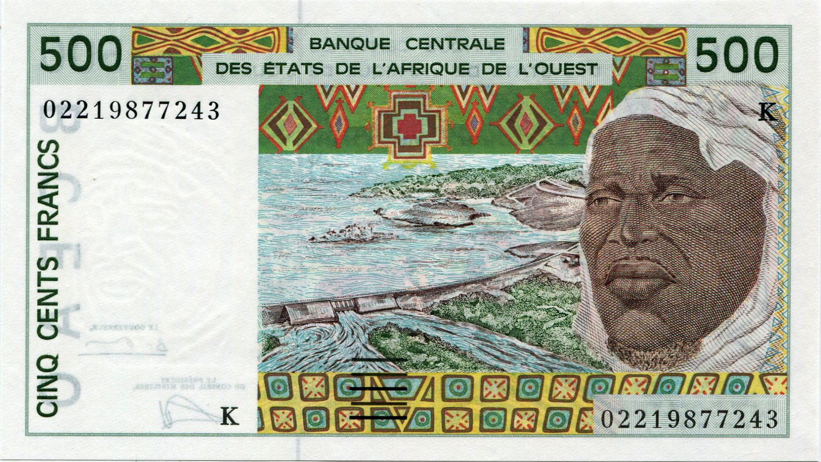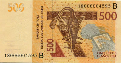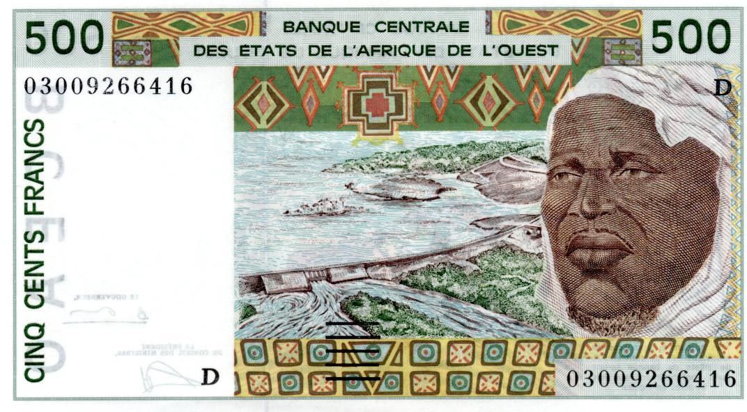 P.119Af- 500 Francs - (20)17. Catfish shaped brass weight of the Ashanti people for weighing gold dust, outline of Africa, tablet PC.