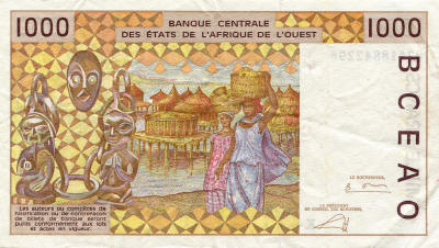 P.811Tg - 1000 Francs - 1997. Twin statue and mask at left , two woman and baskets , elevated riverside storage binds in background.