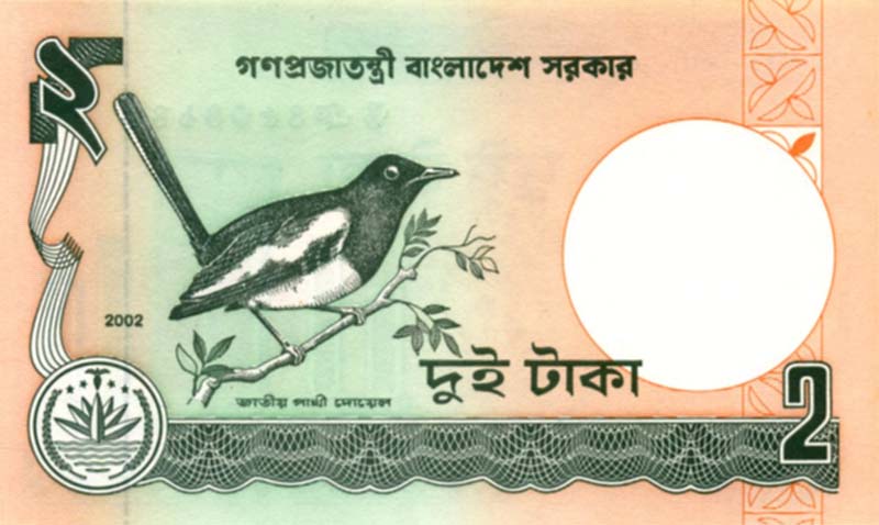P.6C - 2 Taka - 2002. Dhyal or Magpie-robin at left.