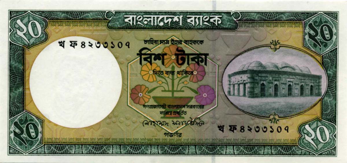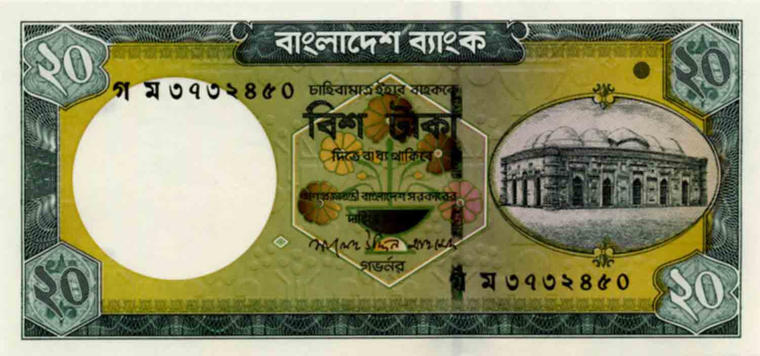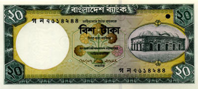 P.27b - 20 Taka - ND (1988)-2002. Chote Sona mosque at right.