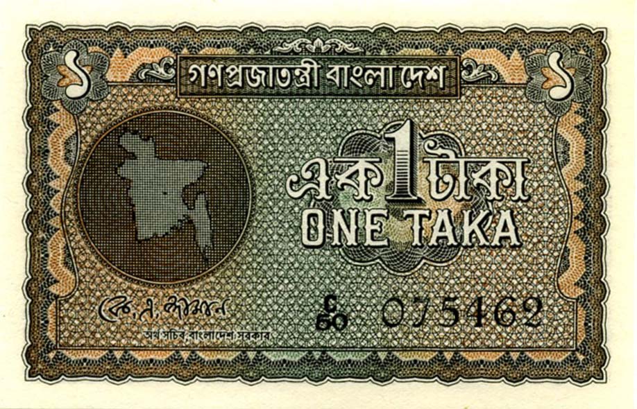 P.4 - 1 Taka - ND (1972). Map of Bangladesh at left.