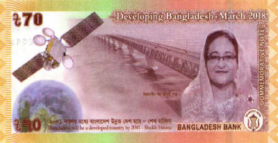 P.65 - 70 Taka - 2018. Bangladesh satellite-1 above globe left, Padma Bridge, Sheik Rasina facing at right.