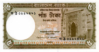 P.25a - 5 Taka - ND (1981). Mihrab in Kushumba mosque at right.