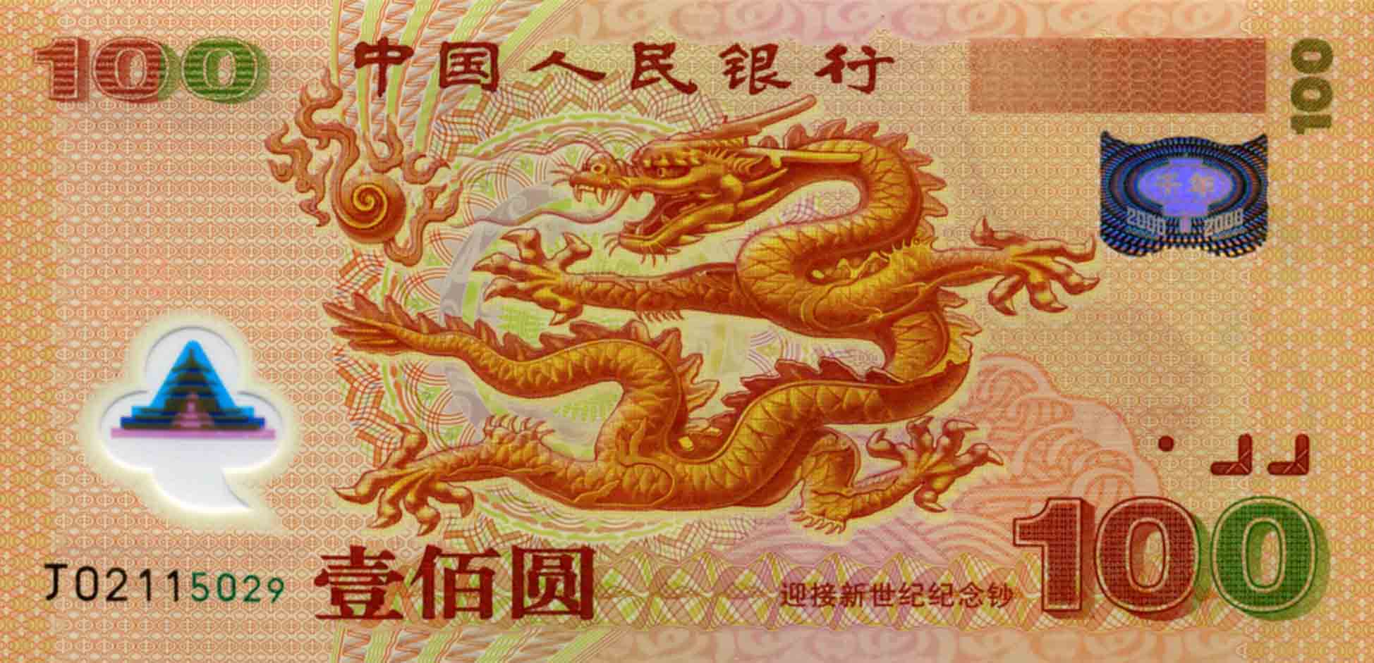 P.902 - 100 Yüan - 2000. Dragon from "Nine Dragons Wall" (Imperial Palace , Peking). 2000 Commemorative Issue.