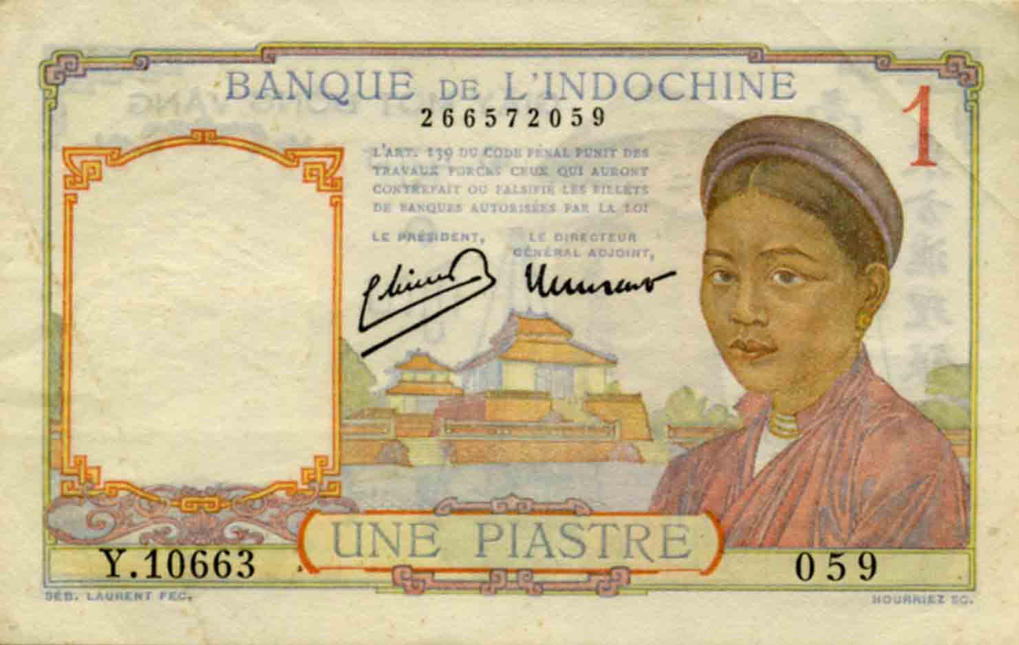 P.54c - 1 Piastre - ND (1932). Signature 11 , Emile Minost (Le President) , Jean Laurent (Le Directeur-general Adjoin).