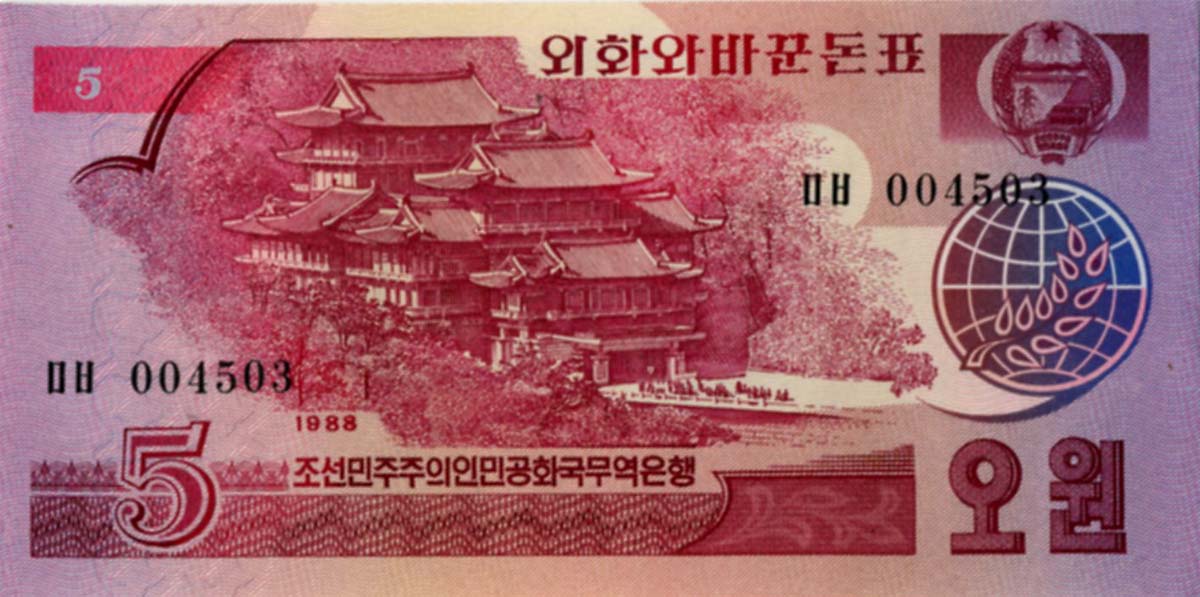 P.36 - 5 Won - 1988. Temple at center, olive spring on globe at right. "SOCIALIST VISITOR" ISSUE