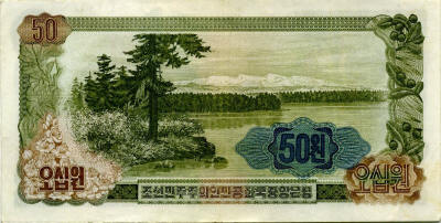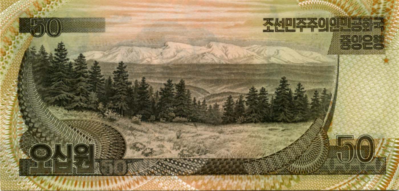 P.42a - 50 Won - 1992. Landscape of pine trees and mountains.