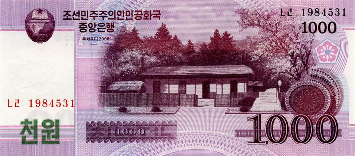 P.64s - 1000 Won - 2008 (2010). Mangyondae (Birthplace of Kim II Sung). Specimen.