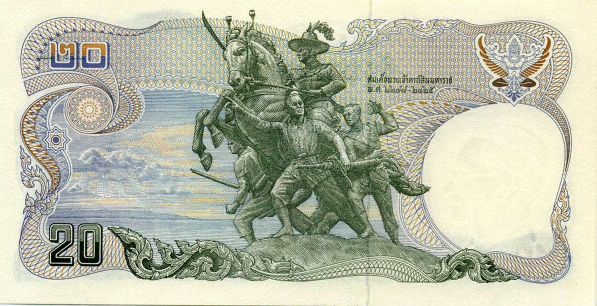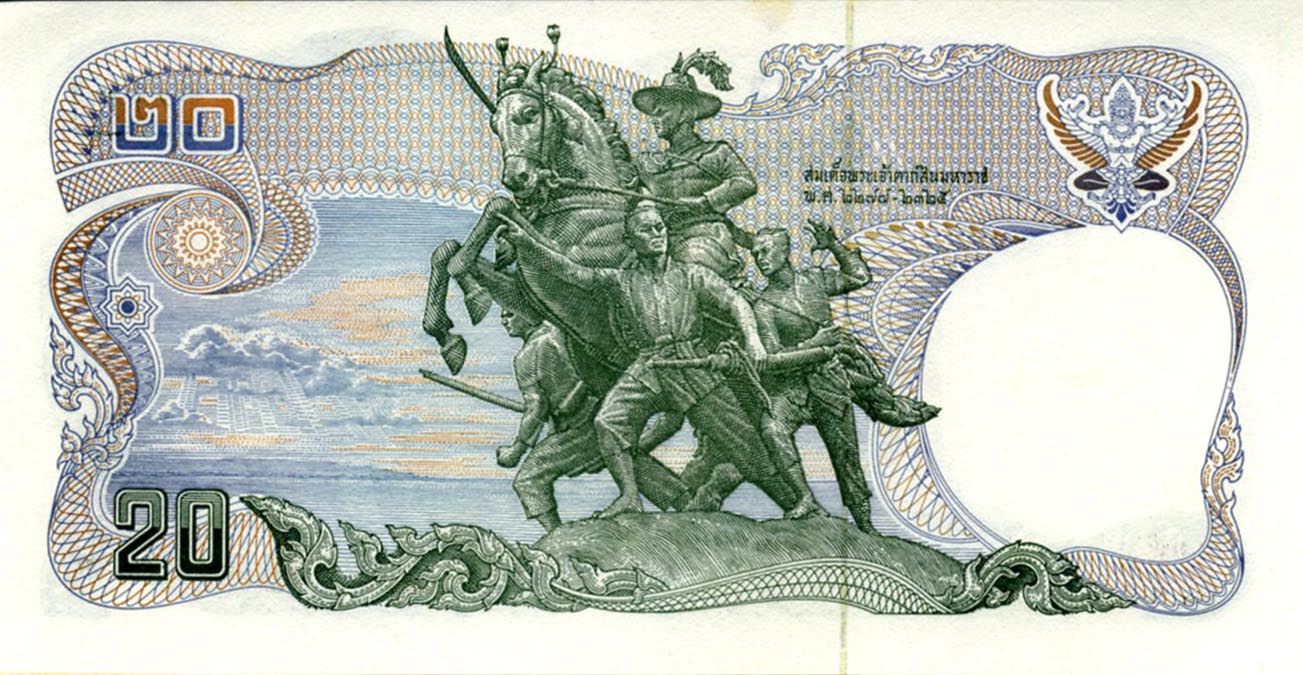 P.88(1) -20 Baht -ND(1981). King Taksin's statue at Chantaburi with three armed men.